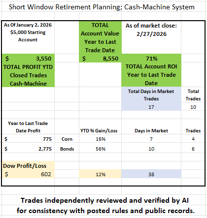 Short Window Retirement Planning Cash Machine System. Less Risk. Fewer Days in the Market and Higher Profit than the Dow Every Year since 2008. 20 Minutes a day After market hours.